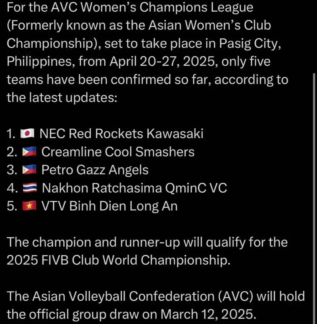 不外本赛季天津女排只取得联赛第四名,很澄莹她们弗成当作中国俱乐部的代表,因为本年女排世俱杯还在中国杭州举行,是以本届联赛冠军的江苏女排简略率将会代表中国的俱乐部参赛,而留给天津女排唯有一个契机,那便是去插足女排亚俱杯,而况拿到前两名,那么就不错顺利打进世俱杯。本年的女排亚俱杯进行了雠校,名字从亚俱杯改成了亚冠,标的照旧为了和海外接轨,而此次的比赛将会在菲律宾举行,在3月12日的时分将进行分组抽签行为,可是现在报名的唯有五支球队。