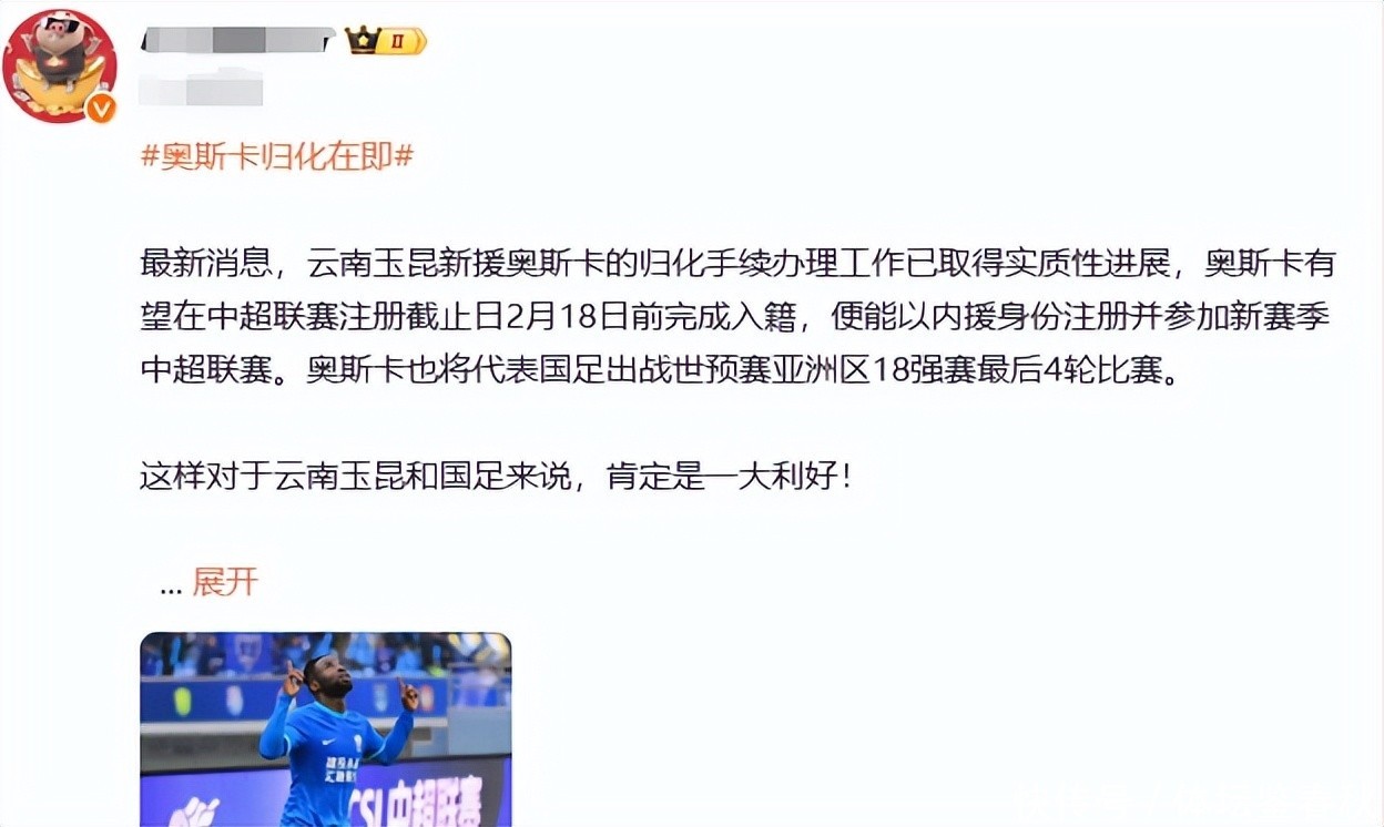 而近日,国足方面再次传来利好音讯。据一位著名体育博主清楚,现遵守于云南玉昆队的奥斯卡也曾完成了通盘的归化手续,有望代表国足出战世初赛亚洲区18强赛终末4轮比赛。另外,北京国安的塞尔吉尼奥,也在昨天办理完成了通盘的归化手续,有望与奥斯卡一同助力国足,这给国足冲击宇宙杯增添了更多但愿。