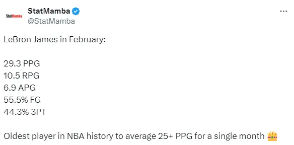 在二月份,詹姆斯出战了11场比赛,场均拿到29.3分10.5篮板6.9助攻,投篮射中率55.5%,三分射中率44.3%;据好意思媒统计,詹姆斯是NBA历史上单月场均得分25+的最年长球员。