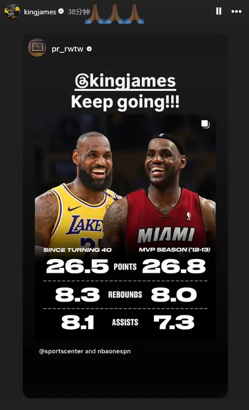 詹姆斯转发我方40岁后与12-13赛季夺得MVP时的数据对比——40岁后,场均26.5分8.3篮板8.1助攻;12-13赛季(旧例赛MVP)场均26.8分8篮板7.3助攻。