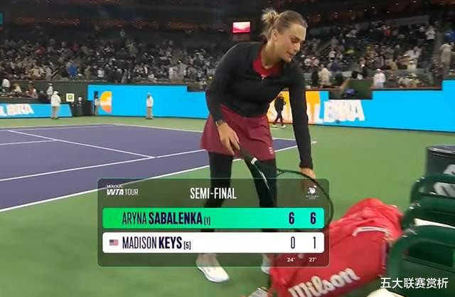 本场与凯斯的半决赛,萨巴伦卡心里憋着一股劲!因为在本年的澳网,萨巴伦卡在决赛中,曾1-2不敌凯斯,丢掉了最焦躁的大满贯冠军。比赛一开场,萨巴伦卡就火力全开。第一盘比赛,她完成3次破发,3次保发,径直送凯斯6-0的秃头!